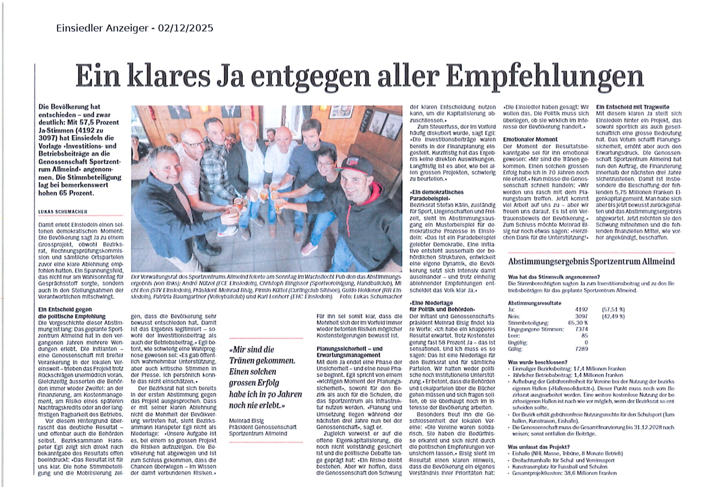 Die Bevölkerung hat entschieden. Mit 57.5% Prozent Ja Stimmen (4192) hat Einsiedeln die Vorlage "Investitions- und Betriebsbeiträge an die Genossenschaft Sportzentrum Allmeind" angenommen.