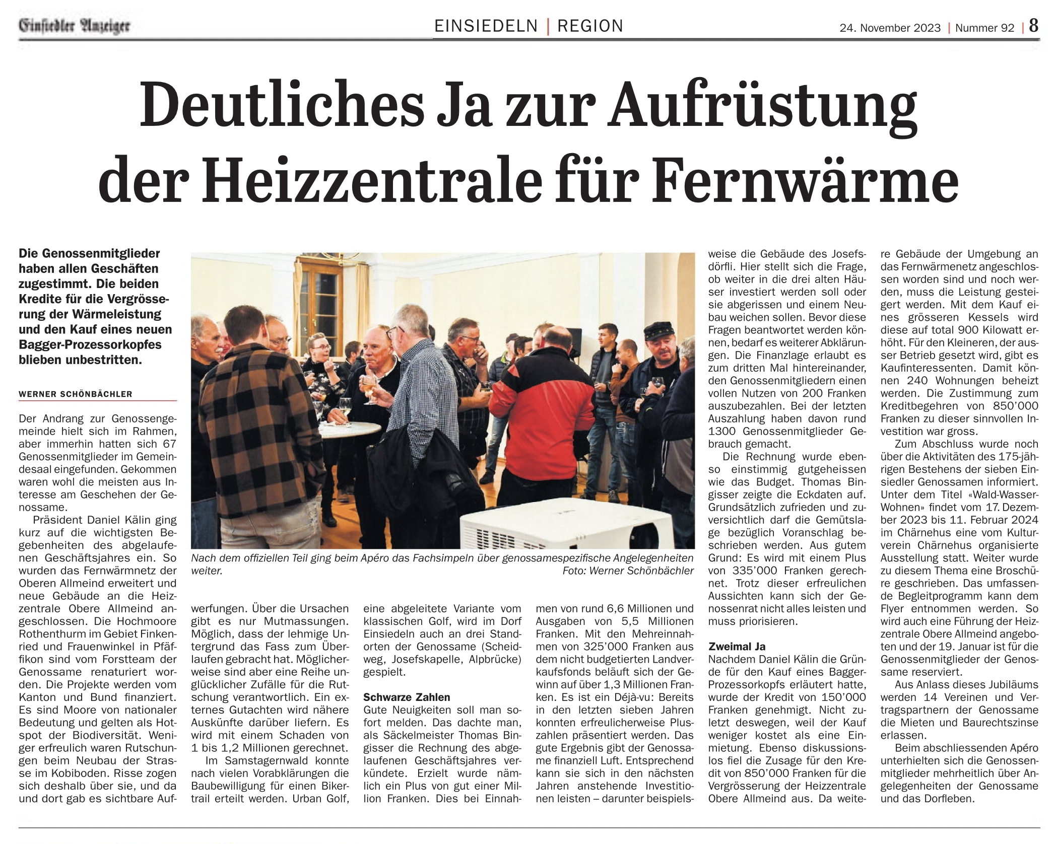 Die Genossengemeinde findet am Mittwoch, 26. November 2025 um 20.00 Uhr im Gemeindesaal des Alten Schulhaus statt.